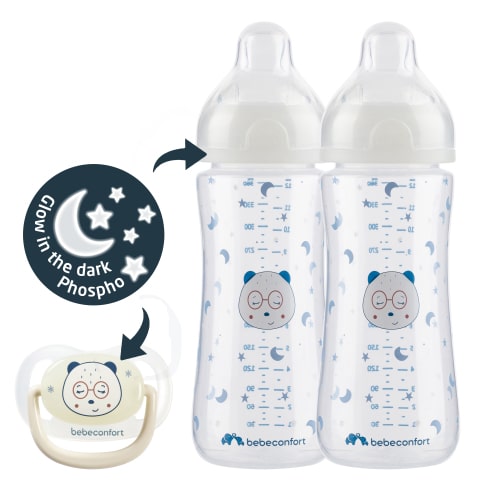 Świecące w ciemności pierścienie na większych butelkach i smoczku pomagają w tworzeniu spokojnej, kojącej atmosfery dla niemowlęcia lub małego dziecka przed snem.